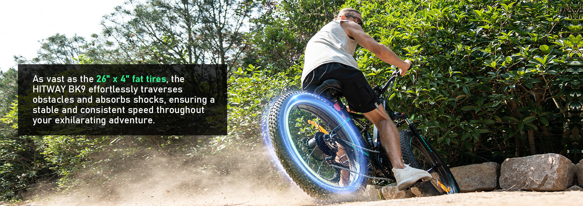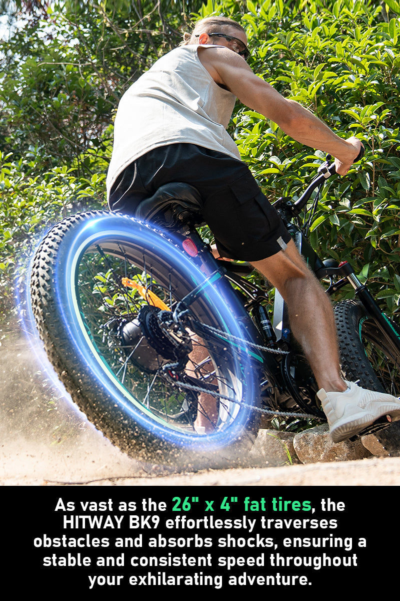 The HITWAY BK9M electric bicycle is equipped with robust 26*4.0 inch all-terrain tires, perfectly suited for a diverse range of terrains and road conditions. Whether it's daily commuting or outdoor adventures, this comfortable electric bicycle stands as the optimal choice for you.